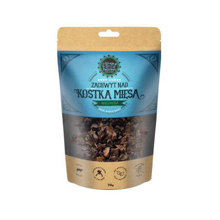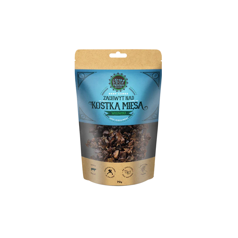 TRZYPSY DELUXE Zachwyt Nad Kostką Mięsa to naturalny i zdrowy przysmak w formie drobnych kostek wykonany ze 100% mięsa. Staranna selekcja wybranych mięs i delikatny proces suszenia zapewniają wyjątkową ucztę dla najbardziej wymagających pupili.