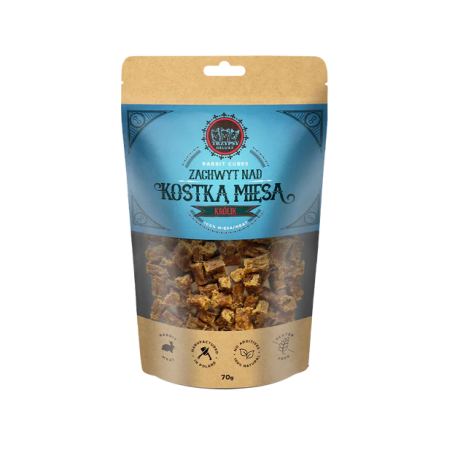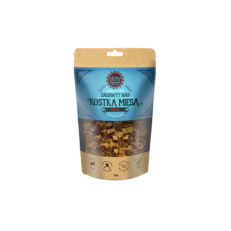 TRZYPSY DELUXE Zachwyt Nad Kostką Mięsa to naturalny i zdrowy przysmak w formie drobnych kostek wykonany ze 100% mięsa. Staranna selekcja wybranych mięs i delikatny proces suszenia zapewniają wyjątkową ucztę dla najbardziej wymagających pupili.