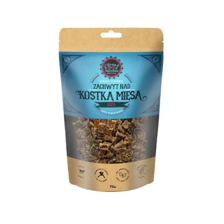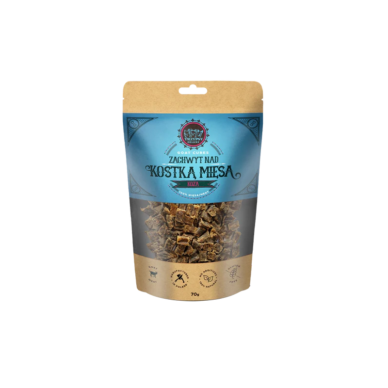 TRZYPSY DELUXE Zachwyt Nad Kostką Mięsa to naturalny i zdrowy przysmak w formie drobnych kostek wykonany ze 100% mięsa. Staranna selekcja wybranych mięs i delikatny proces suszenia zapewniają wyjątkową ucztę dla najbardziej wymagających pupili.