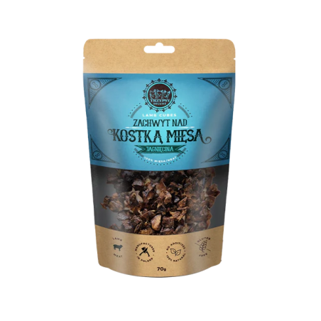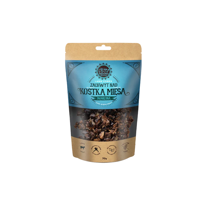 TRZYPSY DELUXE Zachwyt Nad Kostką Mięsa to naturalny i zdrowy przysmak w formie drobnych kostek wykonany ze 100% mięsa. Staranna selekcja wybranych mięs i delikatny proces suszenia zapewniają wyjątkową ucztę dla najbardziej wymagających pupili.