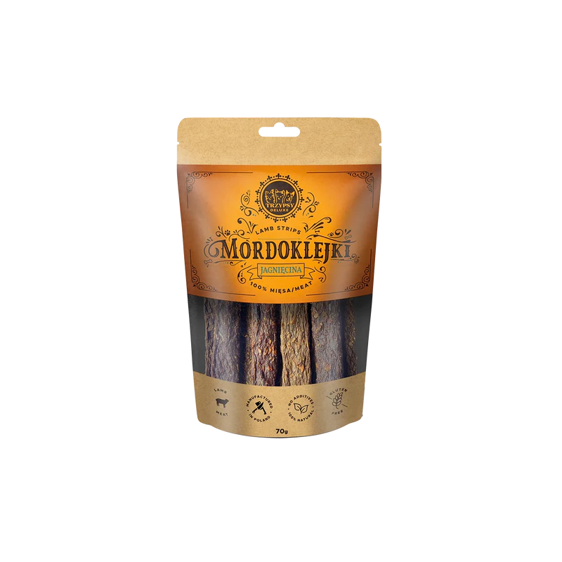 TRZYPSY DELUXE Mordoklejki to w pełni naturalne gryzaki dla psów, wykonane ze 100% mięsa w formie podłużnych pasków. Nie zawierają konserwantów ani barwników. Przysmak ten jest smaczny i pożywny, stanowi doskonałe uzupełnienie codziennej diety naszego pupila. Idealnie sprawdzą się jako nagroda.