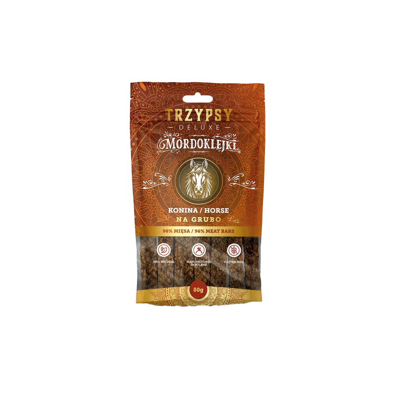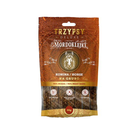 Trzypsy Deluxe Mordoklejki na Grubo to w pełni naturalne gryzaki w formie półmiękkich batonów o długości około 10 cm. Ich prosty skład – bez zbóż, glutenu i sztucznych dodatków – czyni je lekkostrawnym i zdrowym wyborem dla każdego psa. Dzięki swojej strukturze pomagają w redukcji płytki bakteryjnej i wspierają higienę jamy ustnej.