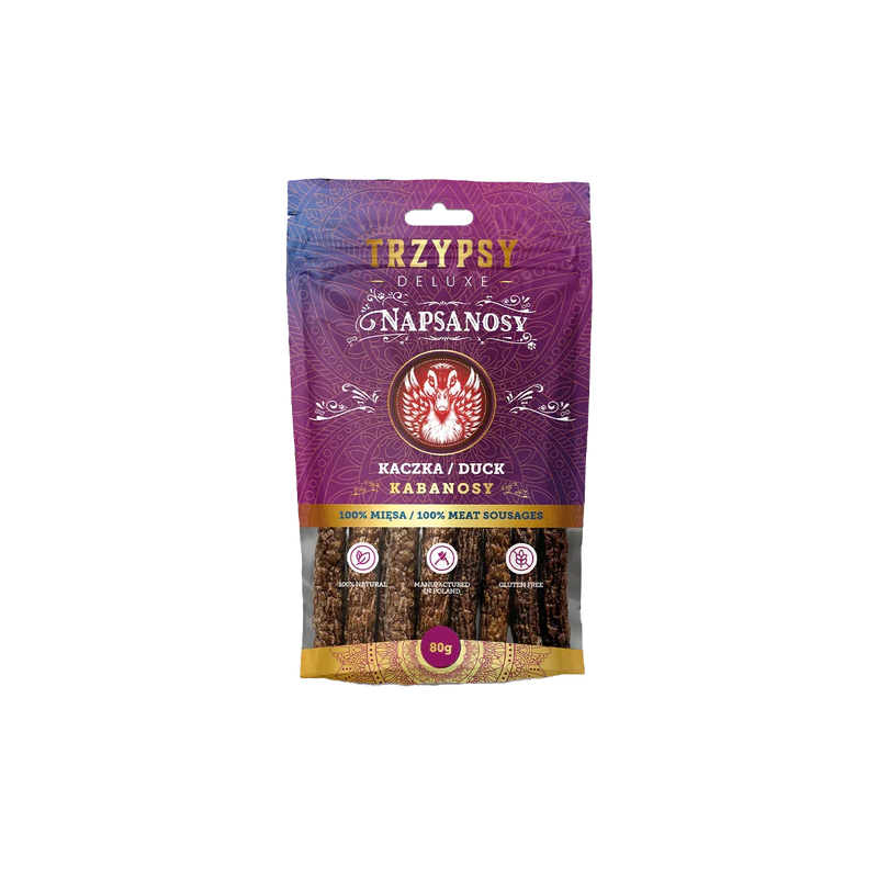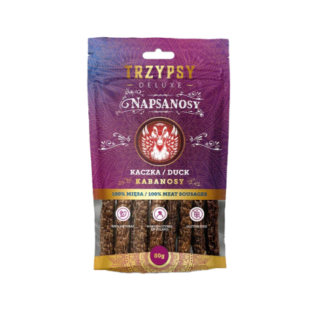 Trzypsy Napsanosy to pyszne kabanosy wykonane ze 100% mięsa, stanowiące zdrowy i naturalny przysmak dla psów. Dzięki starannie dobranym składnikom i delikatnemu suszeniu zachowują wyjątkowy smak oraz wartości odżywcze.