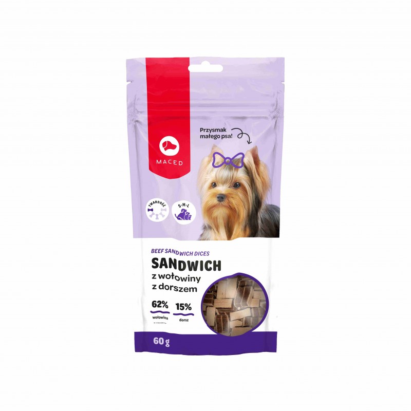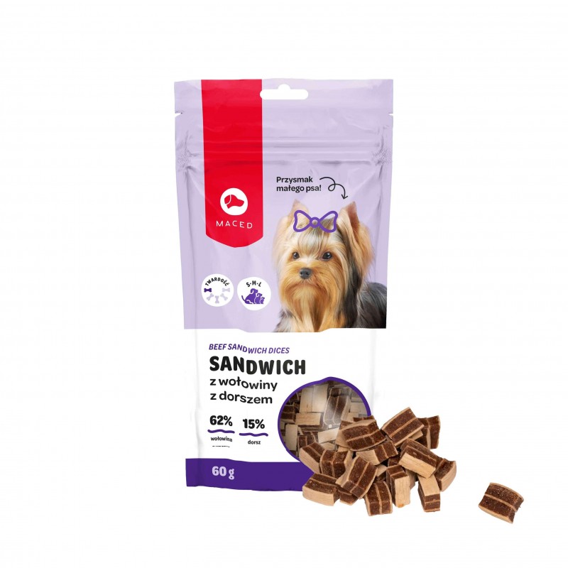 Maced Sandwicz z Wołowiny z Droszem to przysmak małego psa to linia dedykowana najmniejszym czworonogom. Odpowiedni rozmiar kawałków i wyjątkowy smak, sprawiają, że nawet najbardziej wybredne maluchy znajdą swoją ulubioną wersję. Cube z wołowoiny to wyjątkowo smaczny i aromatyczny smakołyk łączący w sobie dopracowaną recepturę oraz zastosowanie nowoczesnej technologii wytwarzania. Wołowina gwarantuje niezapomniany smak oraz sporą dawkę radości i przyjemności z gryzienia. Przysmak polecany jako nagroda po treningu lub spacerze.
