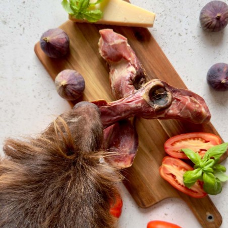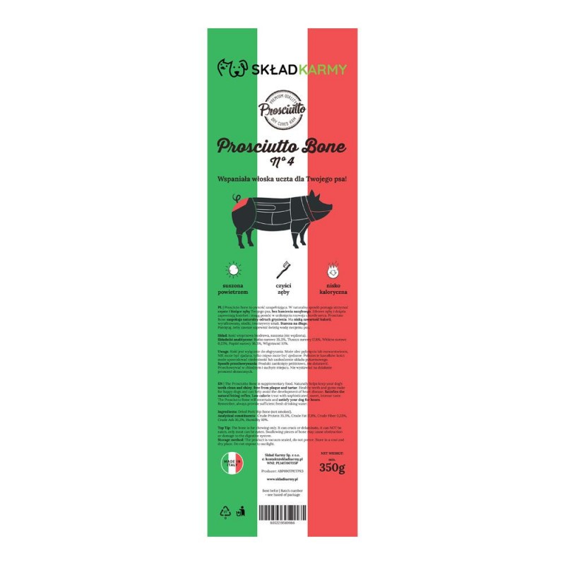 Prosciutto Bone nr. 4 to suszona, dzielona kość z szynki parmeńskiej stworzona z myślą o zachowaniu największej jakości aromatów, idealna dla małych i średnich psów. Nie jest wędzona tylko suszona, co pozwala zachować jej wszystkie właściwości i walory smakowe. Kość nadaje się do gryzienia przez dłuższy czas np. podczas nieobecności właściciela zapewniając psu ciekawe zajęcie oraz uzupełnienie diety o naturalne składniki odżywcze.