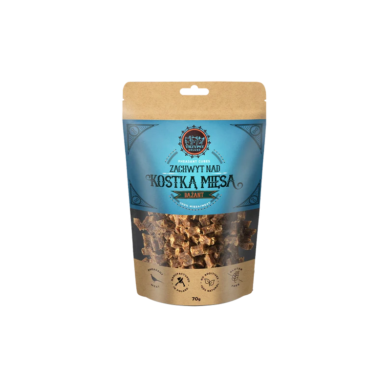 TRZYPSY DELUXE Zachwyt Nad Kostką Mięsa to naturalny i zdrowy przysmak w formie drobnych kostek wykonany ze 100% mięsa. Staranna selekcja wybranych mięs i delikatny proces suszenia zapewniają wyjątkową ucztę dla najbardziej wymagających pupili.