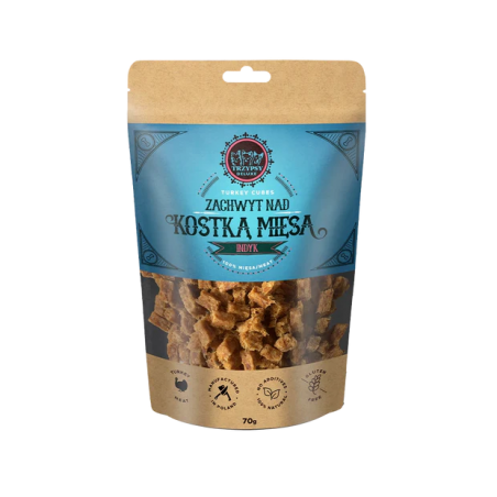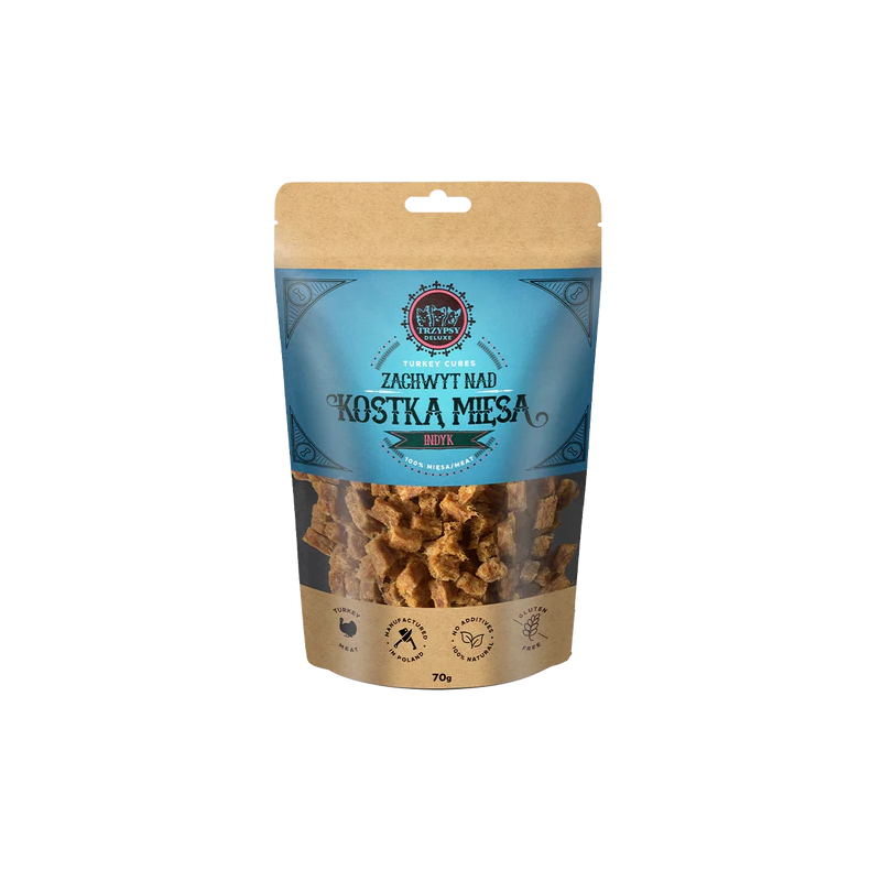 TRZYPSY DELUXE Zachwyt Nad Kostką Mięsa to naturalny i zdrowy przysmak w formie drobnych kostek wykonany ze 100% mięsa. Staranna selekcja wybranych mięs i delikatny proces suszenia zapewniają wyjątkową ucztę dla najbardziej wymagających pupili.
