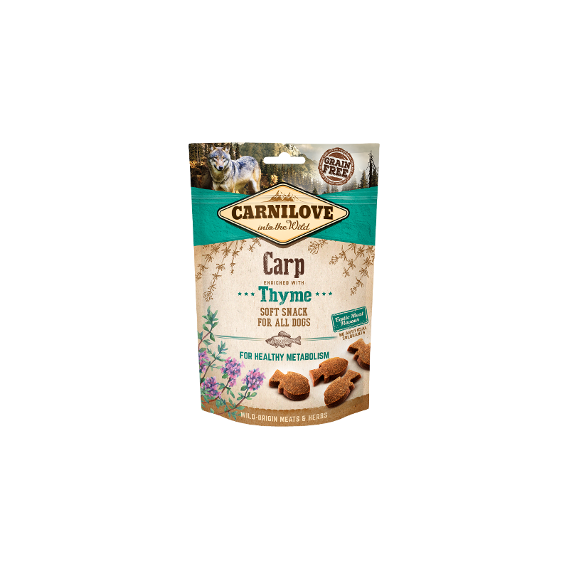 Przysmak Soft Snack z karpiem i tymiankiem dla psa jest zdrowym sposobem na urozmaicenie diety czworonożnego towarzysza. Karp korzystnie wpływa na zdrowie, a jedzony regularnie poprawia pracę serca i pamięć. Tymianek podkręca metabolizm zwierzęcia. Używaj smakołyków Soft Snack jako nagrody lub dla wyćwiczenia pozytywnej motywacji.