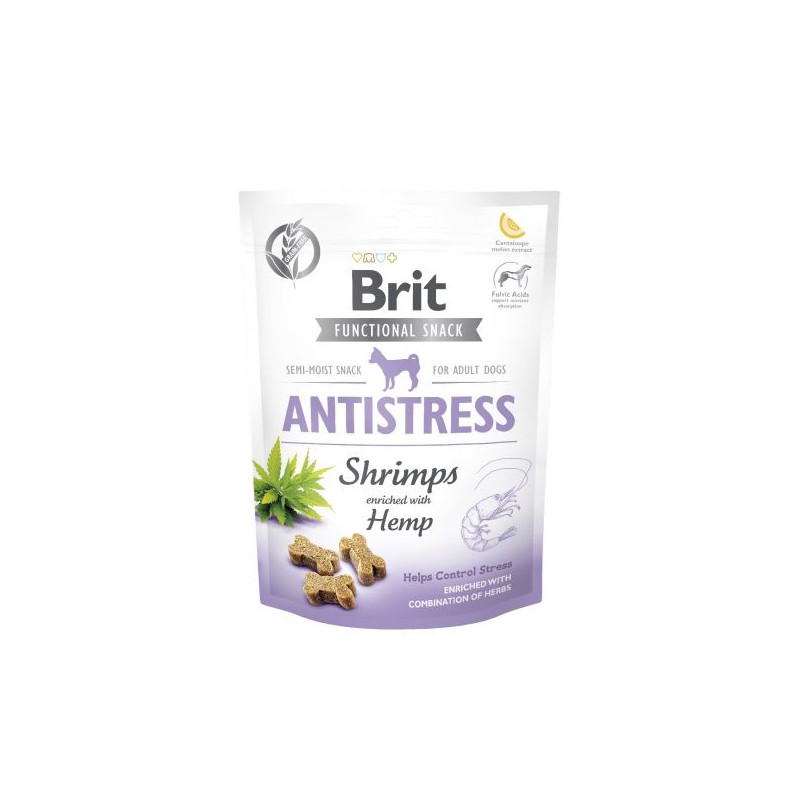 Brit Care Functional Snack Antistress to pysznie i soczyste, bezzbożowe przysmaki bogate w białka z krewetek, wzbogacone o funkcjonalne składniki takie jak pałeczki kwasu mlekowego, kwasy fulwowe czy ekstrakt z kantalupa. Stanowią idealną nagrodę dla Twojego psa podczas spacerów, treningów oraz zwykłego leniuchowania w domu. 10 smacznych rodzajów przysmaków bez zbóż i bez ziemniaków może być podawanych psom w każdym wieku, włączając szczenięta, bez żadnych wyrzutów sumienia.