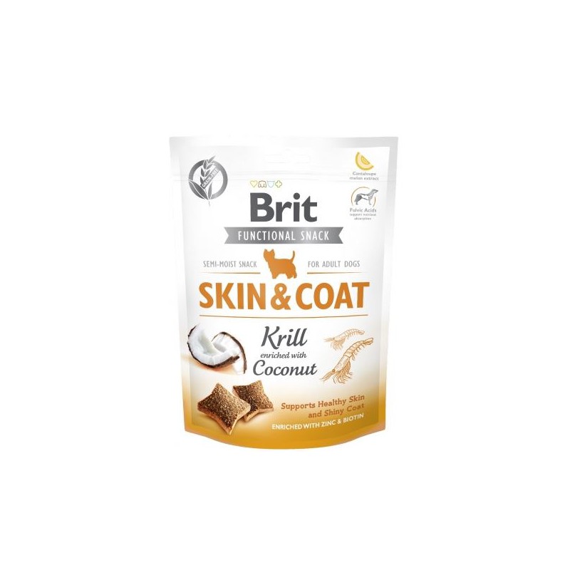 Brit Care Functional Snack Skin & Coat to pysznie i soczyste, bezzbożowe przysmaki pomagające w utrzymaniu odpowiedniej kondycji skóry i sierści psa, wzbogacone o funkcjonalne składniki takie jak pałeczki kwasu mlekowego, kwasy fulwowe czy ekstrakt z kantalupa. Stanowią idealną nagrodę dla Twojego psa podczas spacerów czy treningów. 10 smacznych rodzajów przysmaków bez zbóż i bez ziemniaków może być podawanych psom w każdym wieku, włączając szczenięta, bez żadnych wyrzutów sumienia.