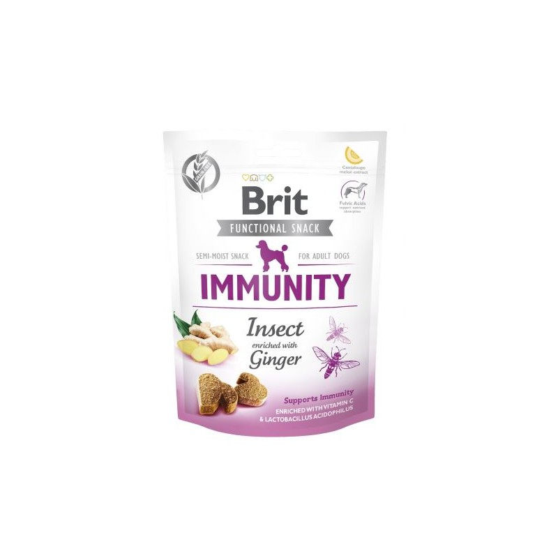 Brit Care Functional Snack Immunity to pysznie i soczyste, bezzbożowe przysmaki pomagające w utrzymaniu odpowiedniej odporności psa, wzbogacone o funkcjonalne składniki takie jak pałeczki kwasu mlekowego, kwasy fulwowe czy ekstrakt z kantalupa. Stanowią idealną nagrodę dla Twojego psa podczas spacerów czy treningów. 10 smacznych rodzajów przysmaków bez zbóż i bez ziemniaków może być podawanych psom w każdym wieku, włączając szczenięta, bez żadnych wyrzutów sumienia.