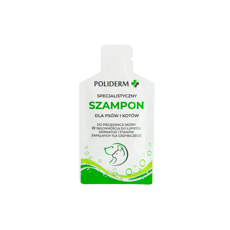 POLIDERM SZAMPON 15ml w saszetce to preparat dla psów i kotów do domowej pielęgnacji skóry i sierści, który sprawdzi się również w pielęgnacji skóry skłonnej do łupieżu, dermatoz i stanów zapalnych tła grzybiczego. Preparat posiada odpowiednie dla skóry psów i kotów pH oraz likwiduje nieprzyjemny zapach. POLIDERM – SZAMPON 15 ml przywraca równowagę mikrobiologiczną skóry oraz oczyszcza, poprawia kondycję okrywy włosowej i zmniejsza świąd. W celu uzyskania najlepszych efektów zaleca się stosowanie produktów Poliderm naprzemiennie.