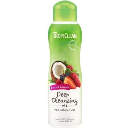 Szampon głęboko oczyszczający o zapachu owoców jagodowych oraz kokosa. Dla psów I kotów w każdym wieku. Nie zawiera parabenów i barwników!
