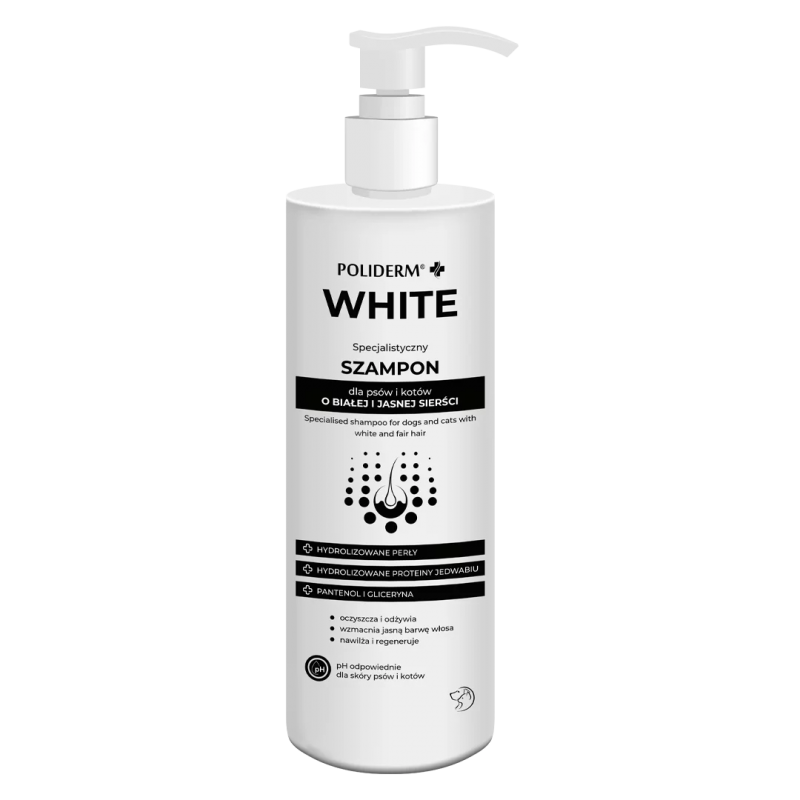 POLIDERM® WHITE szampon służy do pielęgnacji sierści, utrzymania jej w dobrej kondycji. Po kąpieli sierść jest odżywiona i jedwabista w dotyku. Szampon pielęgnacyjny oczyszcza, podkreśla kolor włosa, jak również usuwa nieprzyjemny zapach.