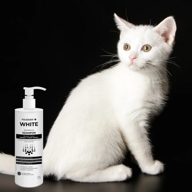 POLIDERM® WHITE szampon do białej i jasnej sierści podkreśla jej naturalny kolor, dodając blasku, rozjaśniając i wygładzając. Szczególnie polecany dla ras takich jak: West Highland White Terrier, Maltańczyk, Samoyed, Owczarek Szwajcarski, Pudel oraz innych psów i kotów o białym i jasnym umaszczeniu.