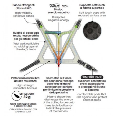 Szelki ERGOVEST, zaprojektowane ergonomicznie z myślą o komforcie naszego czworonożnego przyjaciela, zapewniają pełną swobodę ruchów. Dzięki systemowi WAVE tech oraz geometrii 3-pasmowej rozpraszają niepożądaną energię i ograniczają nacisk, gwarantując spokojne spacery bez otarć na kończynach psa. W całości wyprodukowane we Włoszech, wykonane są z mikrofibry o wysokiej wytrzymałości, są ultralekkie (od 35 do 175 gramów) oraz wyposażone w COMFORT PADS, które zapewniają maksymalny komfort i ochronę miejsc styku.