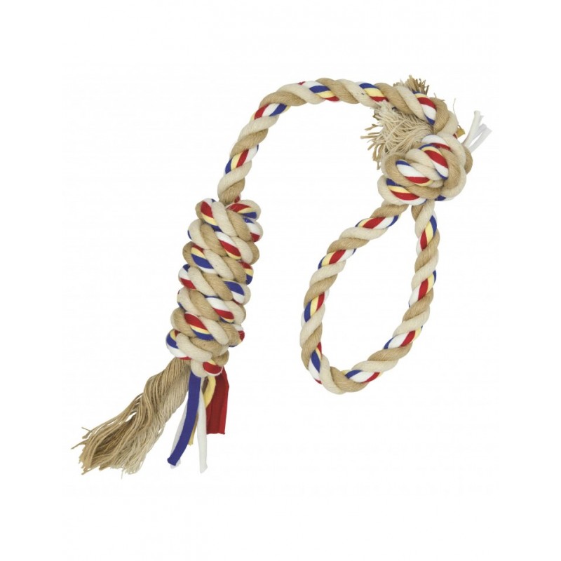 Barry King Sznur z pętlą i piłką, z jutą dla psa jest gryzakiem, który sprawdzi się podczas zabawy w aportowanie i przeciąganie. Ćwiczenia z przeciągania zwiększają moc szczęk psa, a aportowanie udoskonala szybkość i spostrzegawczość czworonoga. Sznur Barry King ma jeszcze jedną fantastyczną właściwość - czyści psie zębiska. Podczas żucia zabawki włókna sznura, szczególnie naturalna juta, dostają się między zęby psa i efektywnie je czyszczą. Przygotujcie się na wspólną przygodę!