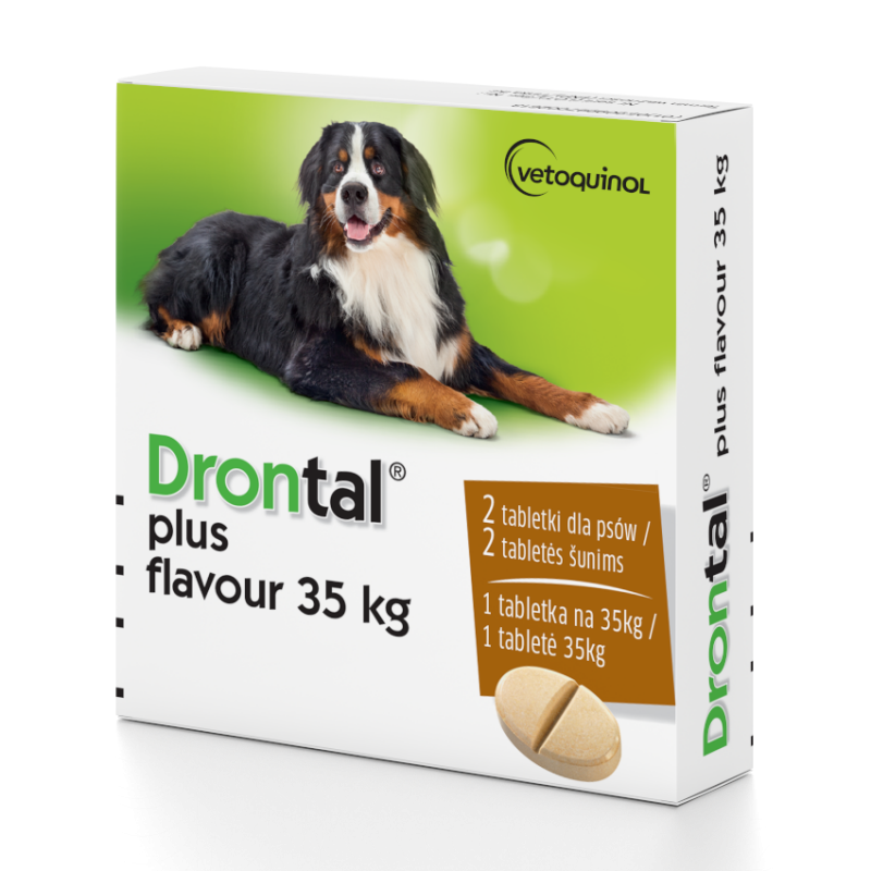 Drontal Plus Flavour 35 kg tabletki dla psów, 525 mg/504 mg/175 mg febantel/pyrantelu embonian/prazykwantel • Wskazania lecznicze: Zwalczanie inwazji nicieni i tasiemców przewodu pokarmowego psów, takich jak: Toxocara canis, Toxascaris leonina, Uncinaria stenocephala, Ancylostoma caninum, Trichuris vulpis, Taenia spp., Multiceps multiceps, Dipylidium caninum,Mesocestoides spp., Echinococcus granulosus, Echinococcus multilocularis. Zwalczanie inwazji pierwotniaków Giardia spp. • Przeciwwskazania: Nie stosować u szczeniąt poniżej 2. Tygodnia życia. Nie stosować u suk w pierwszych dwóch trymestrach ciąży. Nie stosować łącznie z produktami zawierającymi lewamizol, morantel, piperazynę, a także dietylkarbamazol. • Podmiot odpowiedzialny: VETOQUINOL S.A. • Przed użyciem zapoznaj się z treścią ulotki dołączonej do opakowania