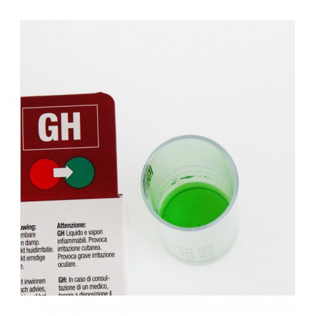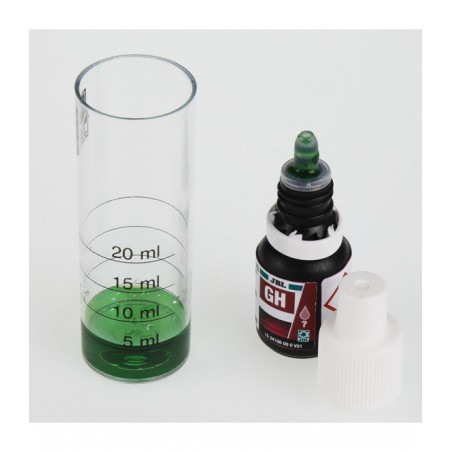 Przy urządzaniu nowego akwarium w pierwszym tygodniu codziennie, potem 1x tygodniowo. Napełnić kuwetę z tworzywa sztucznego wodą z próbki, dodawać kroplami odczynnik do momentu zmiany koloru z czerwonego na zielony. Liczba kropli = Wysokość twardości całkowitej.