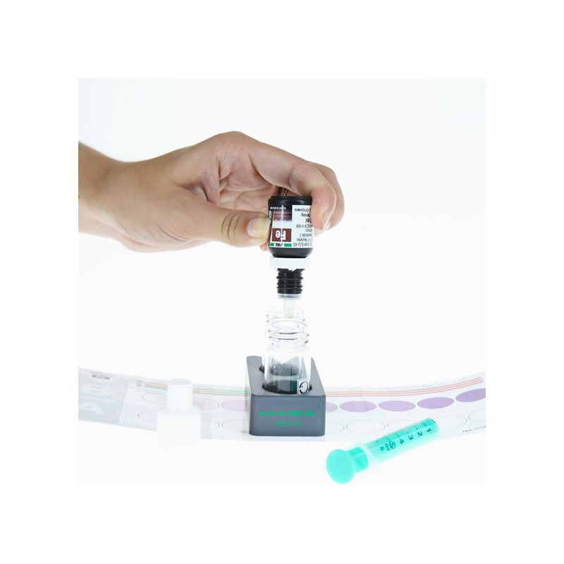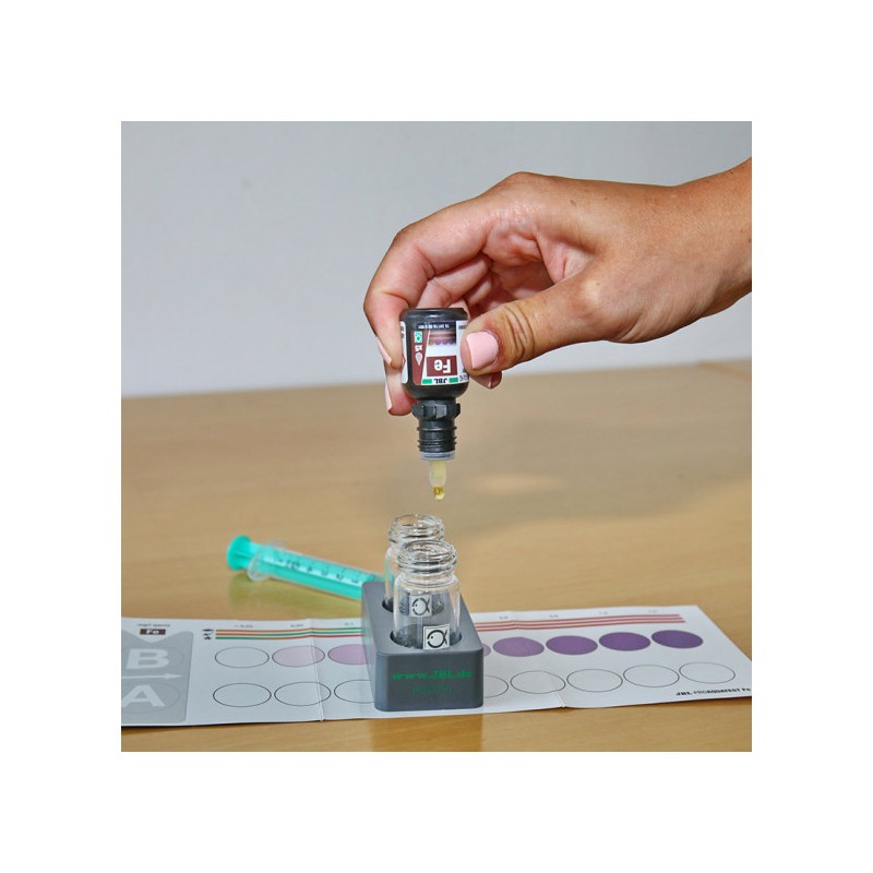 Napełnić szklaną kuwetę wodą próbki, dodać odczynnik do obydwu kuwet, umieścić kuwety w uchwycie, odczytać wartości z karty barw. 1 x po założeniu nowego akwarium, potem co tydzień. W przypadku problemów z zielonymi glonami lub jeżeli rośliny nie rosną optymalnie.