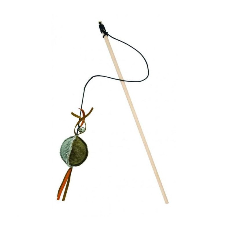 Drewniana wędka dla kota, z szarobrązową piłką.