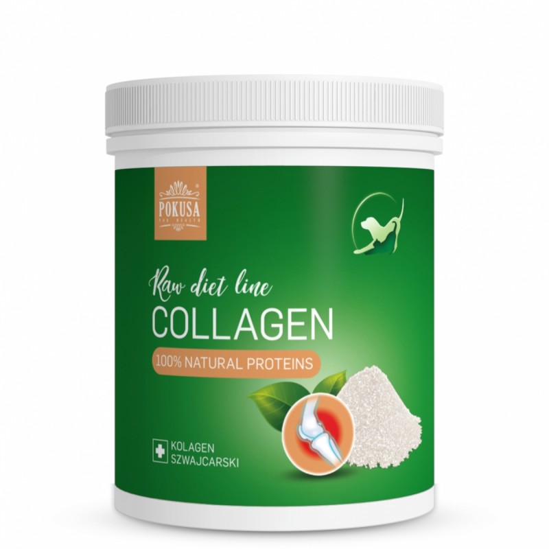 Pokusa RawDietLine Collagen to najwyższej jakości kolagen dla psów i kotów, ekstrahowany ze skór ryb oceanicznych, w łatwo przyswajalnej formie. Zawiera poliaminokwasy, oligopeptydy, polipeptydy kolagenowe oraz szereg aminokwasów, kluczowych do prawidłowego funkcjonowania całego organizmu zwierzęcia, m.in. arginina, glicyna, glutamina czy prolina. Kolagen znajduje zastosowanie w leczeniu i profilaktyce wielu schorzeń. Wspomaga tkankę łączną ścięgien i stawów, zapobiegając urazom i zwiększając ich ruchomość. Regeneruje mięśnie po zbyt intensywnej zabawie lub treningu psów sportowych. Uelastycznia i zmiękcza naskórek, zapobiega jego pękaniu i utracie wilgoci, chroni przed uszkodzeniami spowodowanymi szkodliwym działaniem promieni UV. Kolagen wchodzi w skład struktury włosa i pazurów, odpowiada za ich siłę i sprężystość. Uszczelnia i regeneruje wyściółkę układu pokarmowego, zapobiegając problemom trawiennym poprawiając wchłanianie substancji odżywczych z jelit. Jego prawidłowy poziom w organizmie wpływa na stan naczyń krwionośnych.