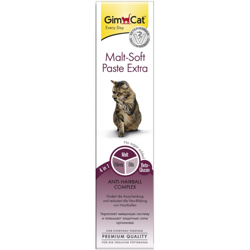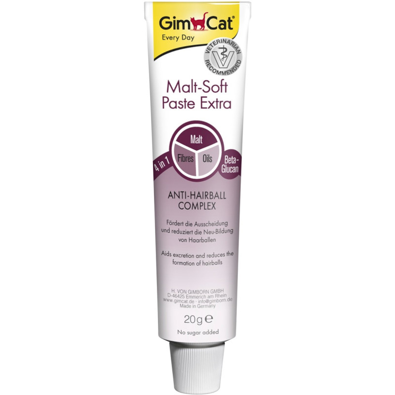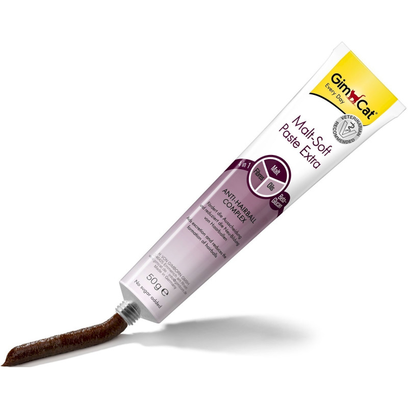 Pasta GimCat Malt-Soft Paste Extra zawiera wyjątkowy kompleks Anti-Hairball dzięki któremu wspomaga wydalanie kłaczków z układu pokarmowego kota. Połączenie ekstraktu słodowego, wysokiej jakości olejków i błonnika wspomaga naturalne wydalanie połkniętych włosów, a tym samym ogranicza ponowne powstawanie kul włosowych. Ponadto zapobiega powstawaniu zaburzeń trawiennych spowodowanych przez tworzenie się kul włosowych, a beta-glukany zapobiegają stanom zapalnym w przewodzie pokarmowym.