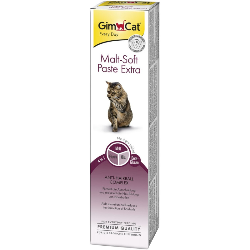 Pasta GimCat Malt-Soft Paste Extra zawiera wyjątkowy kompleks Anti-Hairball dzięki któremu wspomaga wydalanie kłaczków z układu pokarmowego kota. Połączenie ekstraktu słodowego, wysokiej jakości olejków i błonnika wspomaga naturalne wydalanie połkniętych włosów, a tym samym ogranicza ponowne powstawanie kul włosowych. Ponadto zapobiega powstawaniu zaburzeń trawiennych spowodowanych przez tworzenie się kul włosowych, a beta-glukany zapobiegają stanom zapalnym w przewodzie pokarmowym.