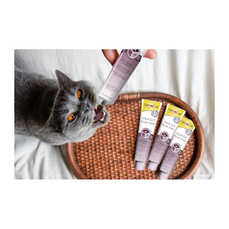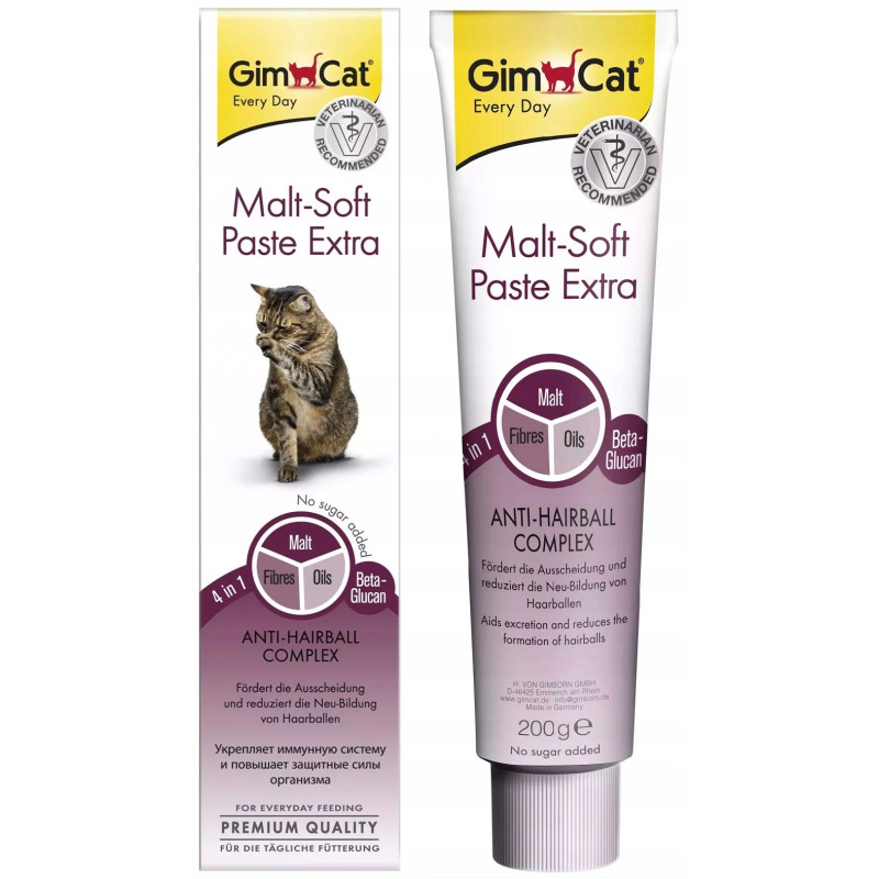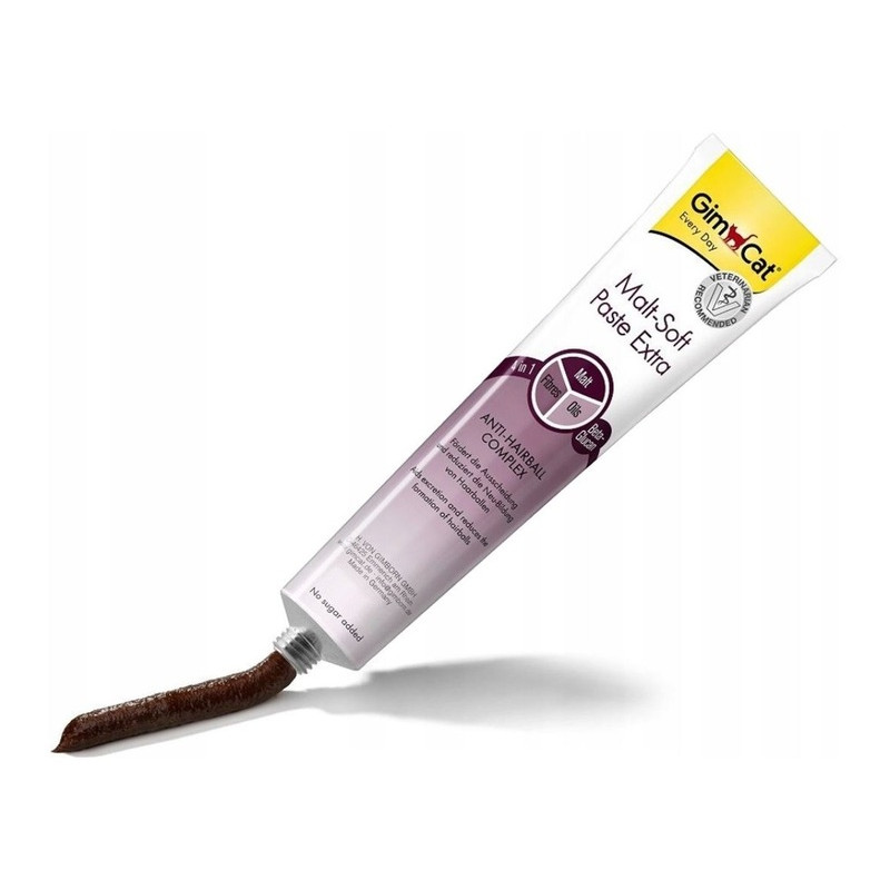 Pasta GimCat Malt-Soft Paste Extra zawiera wyjątkowy kompleks Anti-Hairball dzięki któremu wspomaga wydalanie kłaczków z układu pokarmowego kota. Połączenie ekstraktu słodowego, wysokiej jakości olejków i błonnika wspomaga naturalne wydalanie połkniętych włosów, a tym samym ogranicza ponowne powstawanie kul włosowych. Ponadto zapobiega powstawaniu zaburzeń trawiennych spowodowanych przez tworzenie się kul włosowych, a beta-glukany zapobiegają stanom zapalnym w przewodzie pokarmowym.