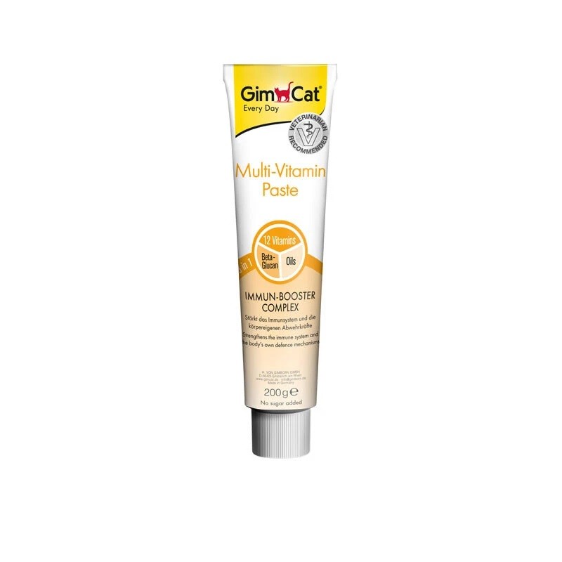 Pasta GimCat Multiwitamina zawiera wyjątkowy kompleks 3 w 1 z zawierający 12 niezbędnych witamin, beta-glukan i wysokowartościowe oleje, które działają razem aby wzmocnić układ odpornościowy oraz naturalne siły obronne organizmu.