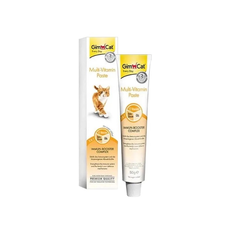 Pasta GimCat Multiwitamina zawiera wyjątkowy kompleks 3 w 1 z zawierający 12 niezbędnych witamin, beta-glukan i wysokowartościowe oleje, które działają razem aby wzmocnić układ odpornościowy oraz naturalne siły obronne organizmu.