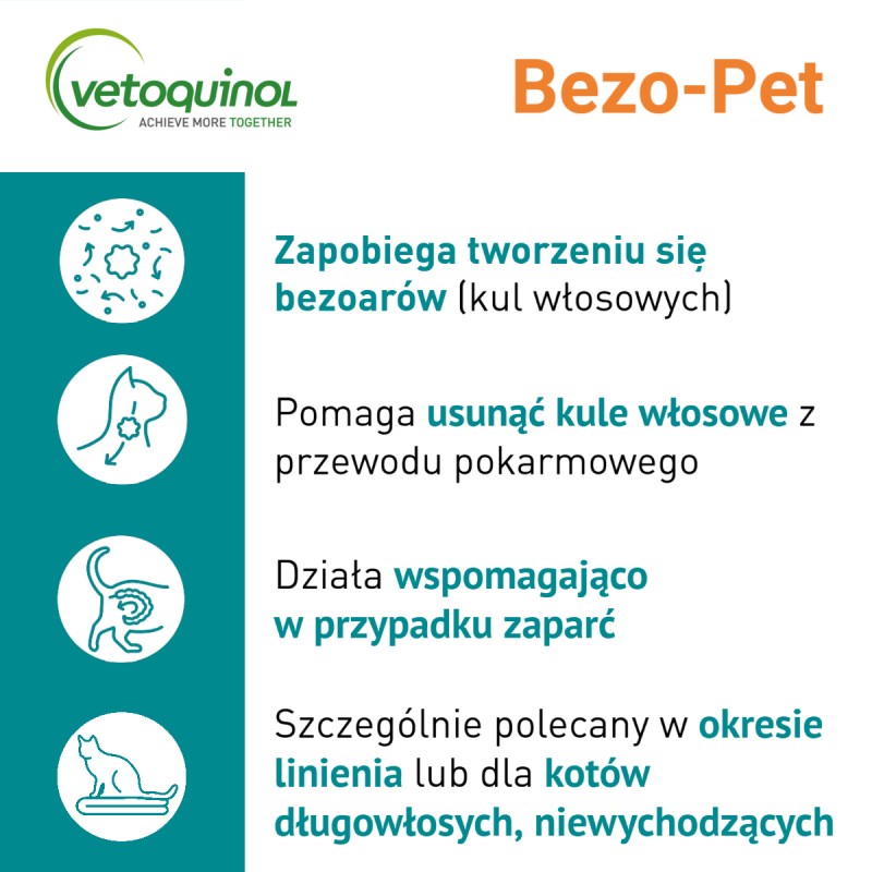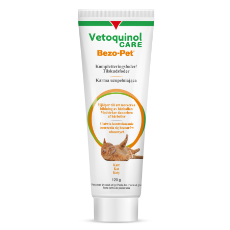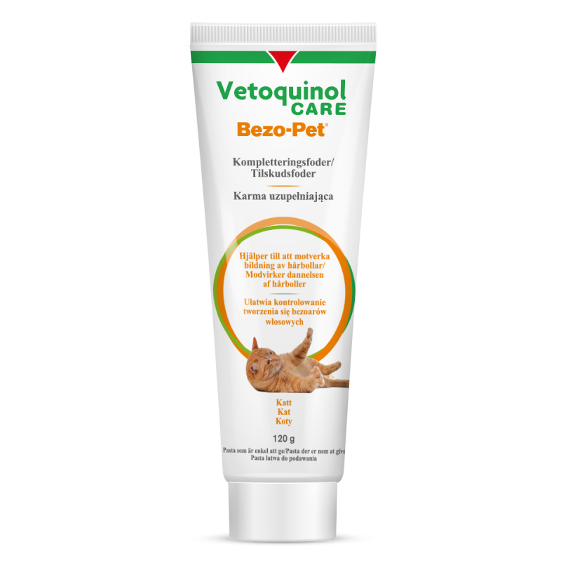 Koty niewychodzące potrzebują troski i uważnego oka właściciela. Dlatego powstał Bezo-Pet - karma uzupełniająca w postaci pasty. Dzięki zawartości olejów, pasta odkłaczająca okrywa włosy znajdujące się w żołądku, a dzięki swoim poślizgowym właściwościom ułatwia proces pozbywania się ciał obcych zalegających w układzie pokarmowym pupila. Bezo-Pet ogranicza tworzenie się bezoarów i pomaga pozbyć się istniejących już kul włosowych. Produkt działa wspomagająco również w przypadku zaparć.