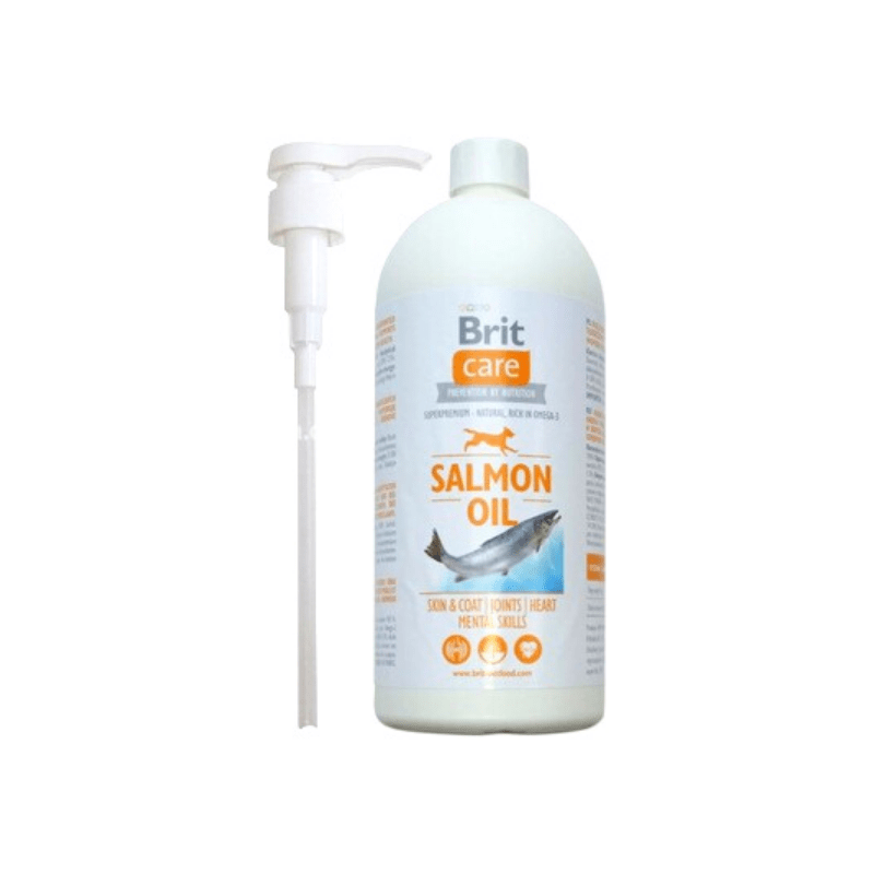 Suplement diety BRIT Care olej z łososia jest dostępny w pojemnikach z praktyczną pompką, ułatwiającą dozowanie.