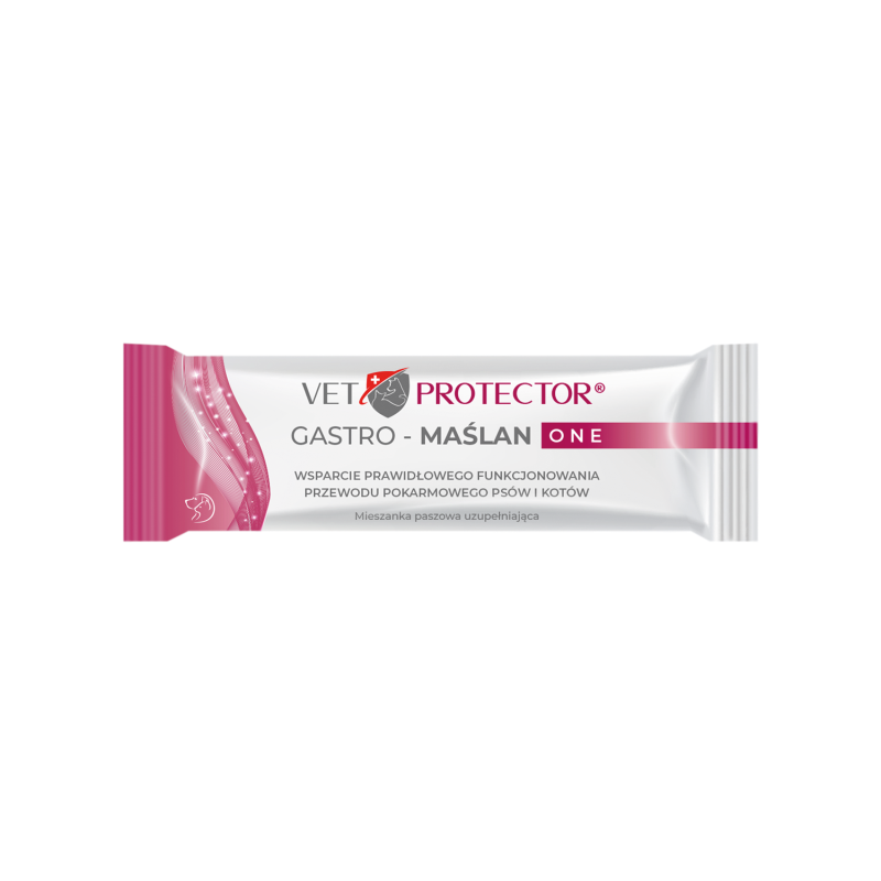 VET PROTECTOR GASTRO MAŚLAN 3 ml to preparat w postaci pasty, wspierający prawidłowe funkcjonowanie przewodu pokarmowego i regenerację nabłonka jelit psów i kotów. Maślan sodu to źródło kwasu masłowego, który jest podstawowym materiałem energetycznym dla nabłonka jelit i wspiera funkcjonowanie kosmków jelitowych, działa przeciwbiegunkowo i wspomaga odbudowę flory bakteryjnej jelit.