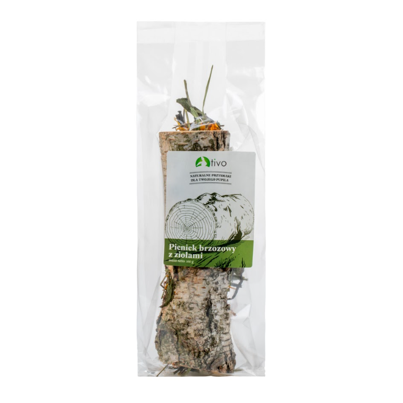 Pieniek brzozowy z ziołami babką lancetowatą i nagietkiem – doskonały do ścierania ząbków i walki z nudą. Jest traktowany jako wspaniała zabawka dla pupila, nieoceniony sposób pobudzający do aktywności. Pieniek jest wielokrotnego użytku, można go napychać siankiem, ziołami lub ulubionymi przysmakami.