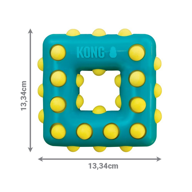 Kong Dotz Square to wytrzymały gryzak z wypustkami. Wykonanie gryzka z trwałej gumy TPR, zapewnia długowieczność zabawki, nawet jeśli będzie używana przez bardzo żywiołowego psiaka. Czarne wypustki pomagają w higienie jamy ustnej oraz masują dziąsła psa. Ring można również traktować jako zabawkę do aportowania, a jej nie przewidywalne odbijanie się od powierzchni zapewni jeszcze więcej radości Twojemu czworonogowi. Różnorodność tekstur pozwoli na wielogodzinne zajęcie psiaka.