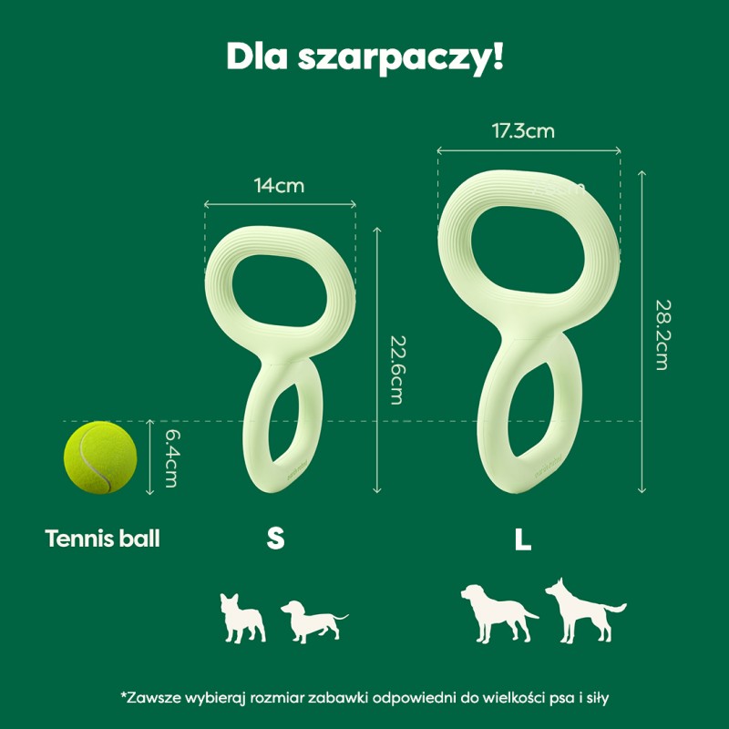 Zabawka ma gładki, zakrzywiony kształt, co sprawia, że jest wygodna do podnoszenia zarówno dla ludzi, jak i psów. Ergonomiczna konstrukcja chroni nadgarstek, wspierając naturalny zakres ruchu podczas przeciągania, a także zapewnia bezpieczną odległość, aby Twój pies mógł swobodnie szarpać, bez ryzyka przypadkowego chwycenia za dłoń opiekuna.