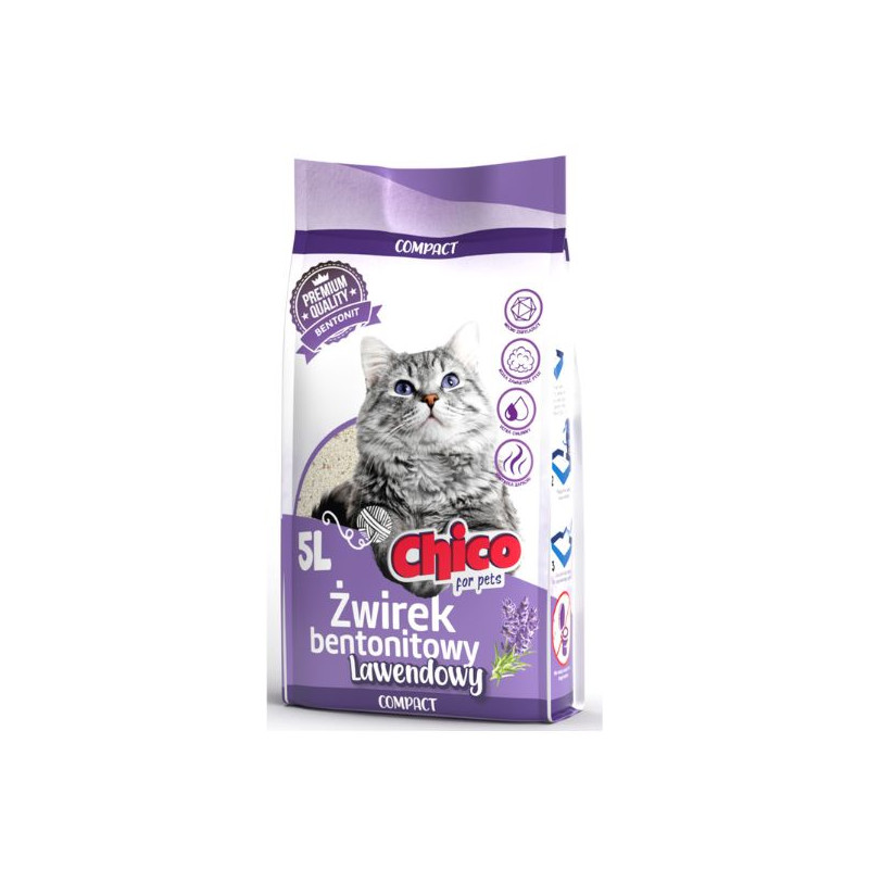Zbrylający żwirek dla kota Chico Compact Lawenda wytworzony został z najlepszego białego bentonitu co zapewnia doskonałą higienę oraz rewelacyjne właściwości kontroli zapachu. Żwirek jest odpylony aż w 99,5% dzięki czemu unikniesz kurzu podczas korzystania i uzupełniania kuwety, a niewielkie granulki compact zapewniają super zbrylanie. Dodatek lawendowych granulek skutecznie redukuje nieprzyjemny zapach zastępując go przyjemnym, lawendowym uwielbianym także przez koty.