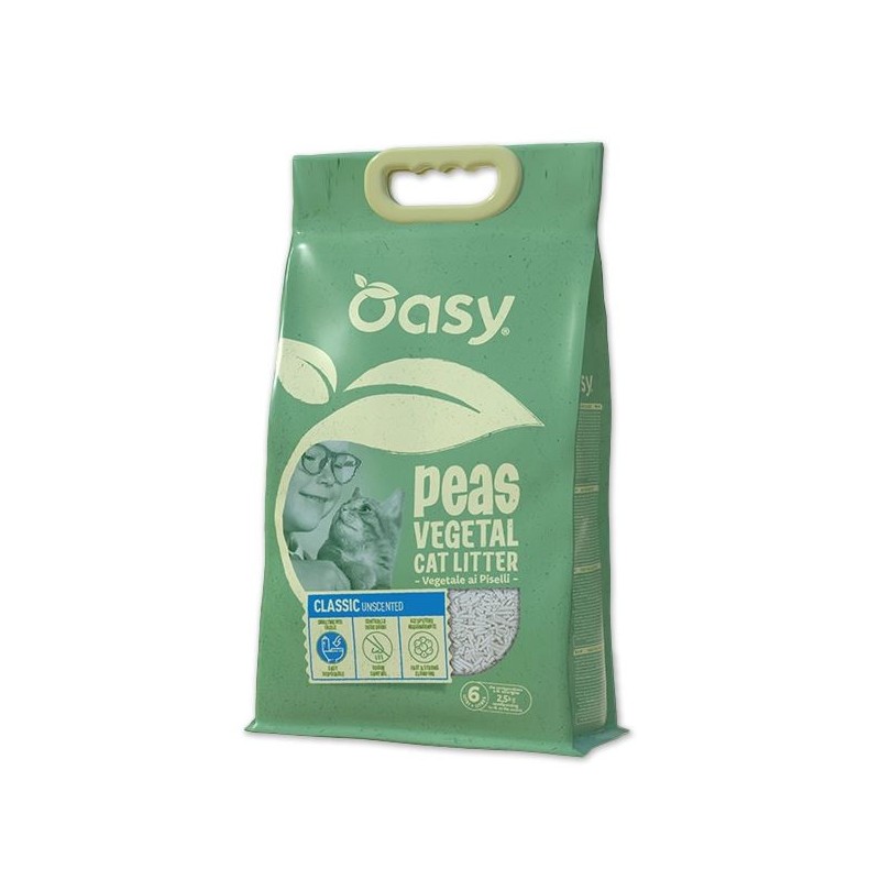 Oasy Vegetal to świat naturalnych żwirków dla kotów, które są w 100% biodegradowalne i przyjazne dla środowiska. Żwirek dla kota Oasy Peas jest produkowany z wysokiej jakości składników roślinnych, takich jak włókna grochu, skrobia kukurydziana i guma guar. Mikrogranulki żwirku są lekkie, mają bardzo wysoką chłonność i neutralizują nieprzyjemny zapach, zapewniając dobre samopoczucie kota i czysty dom.
